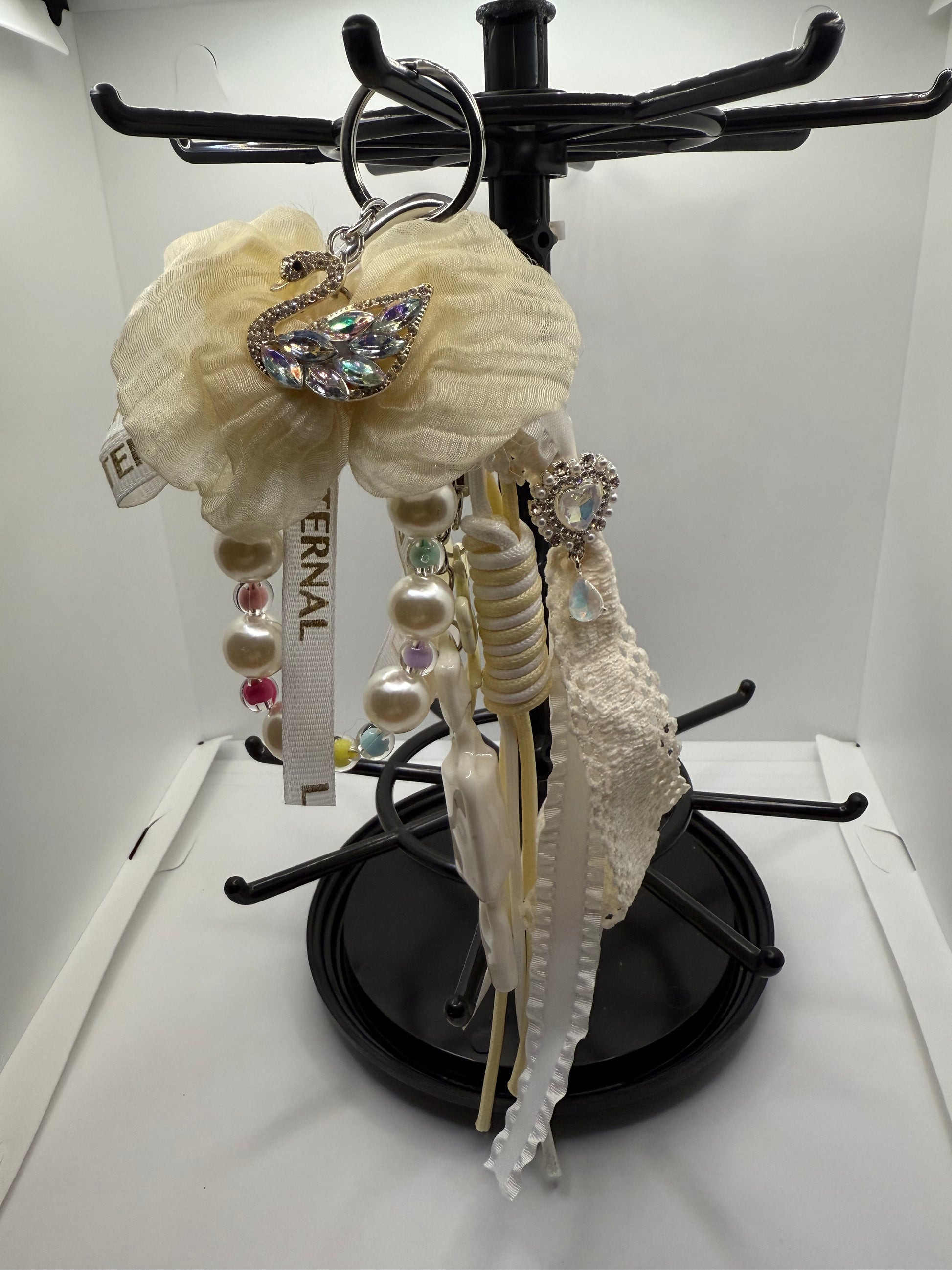 Enhance your handbag with our elegant White Bow Handbag Charm. The white bow adds a touch of sophistication to any handbag, making it the perfect accessory for any outfit. Made with high-quality materials, this charm is durable and stylish. Elevate your style with our White Bow Handbag Charm.