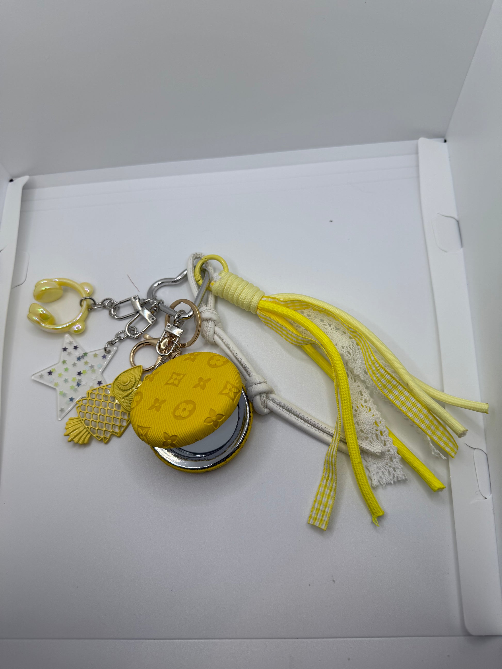 Add a touch of style to your handbag with the Yellow Mirror Handbag Charm. Featuring a sleek yellow mirror and matching charms, this accessory will not only add a pop of color to your bag but also ensure you always have a mirror on hand. Elevate your fashion game with this chic and functional charm.